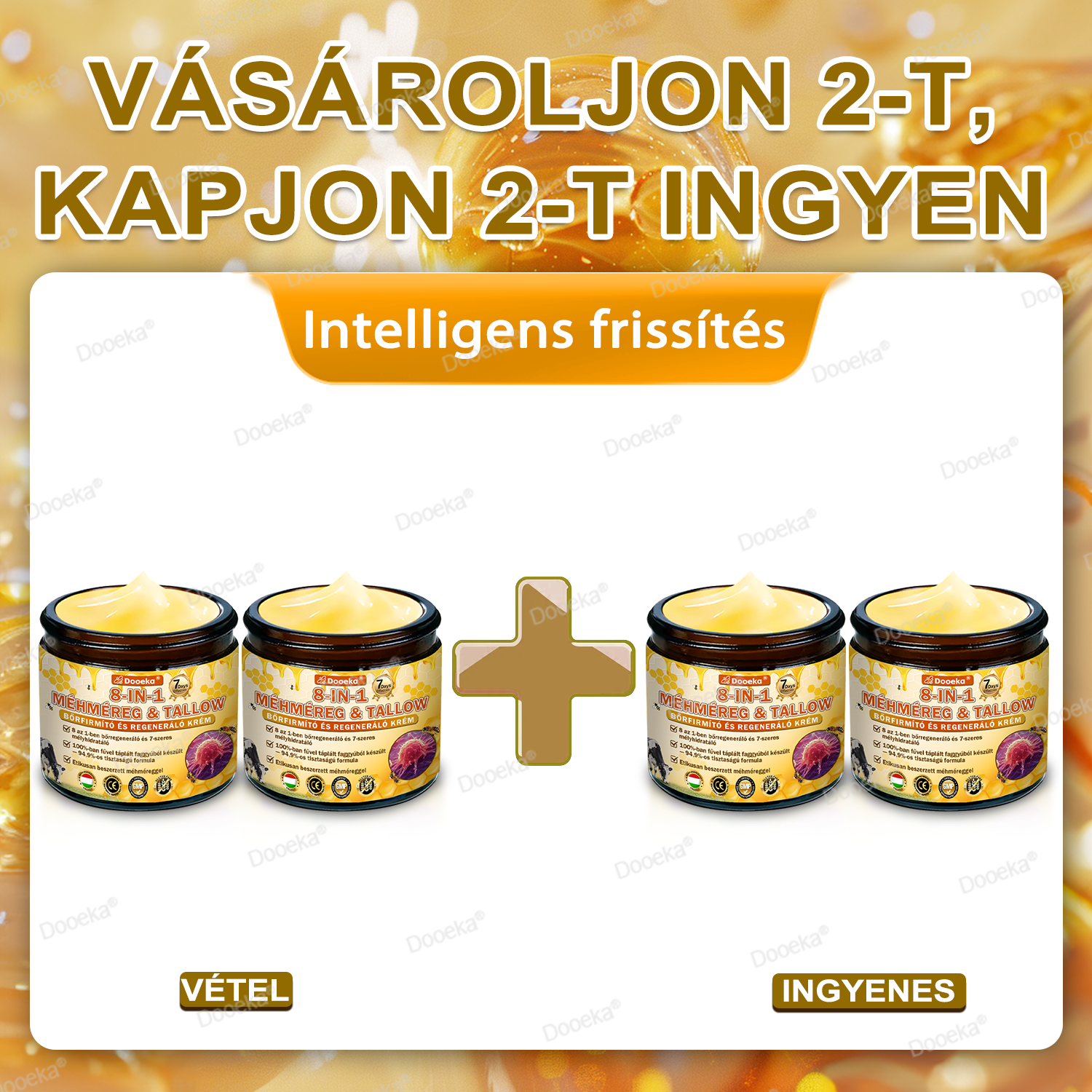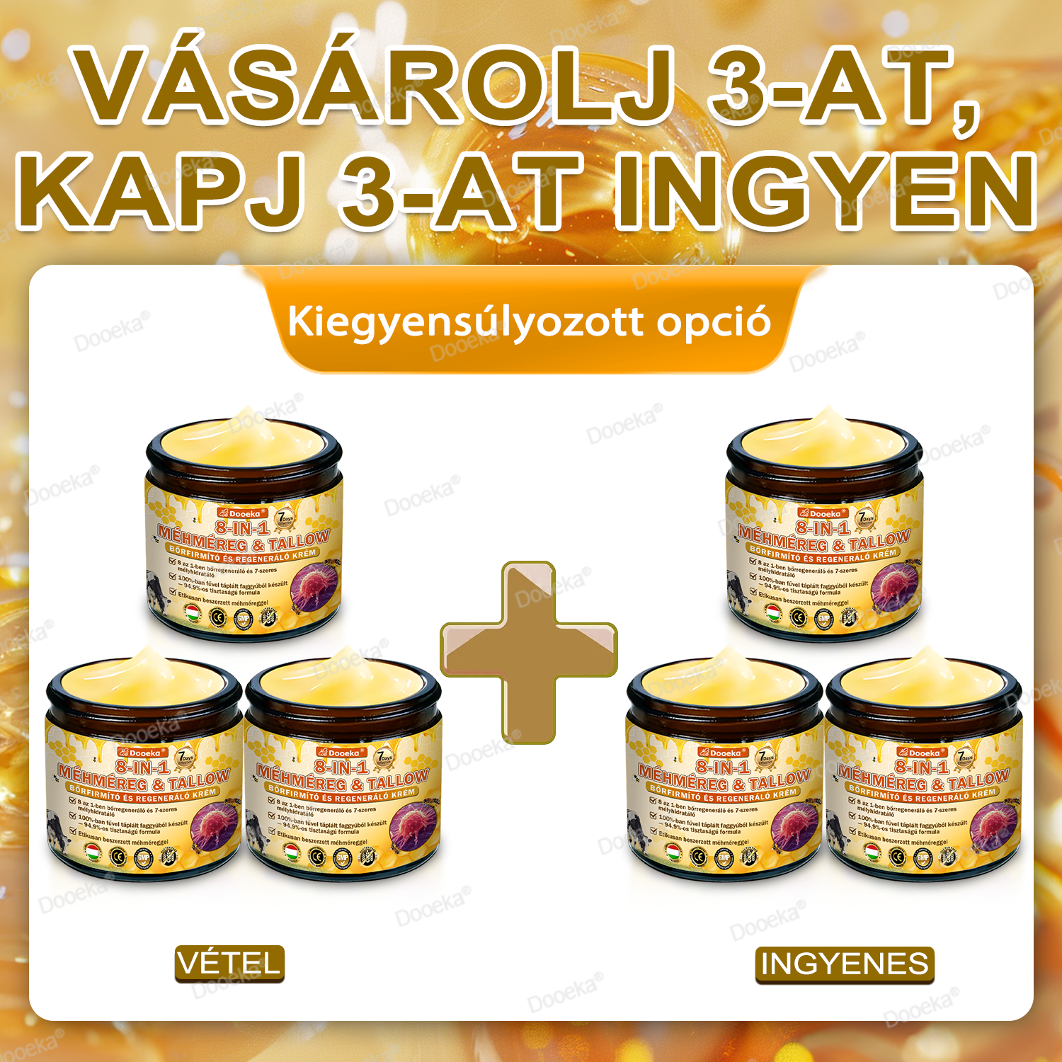 Ennek érdekében az Dooeka® 𝟖-𝐈𝐧-𝟏 Méhméreg & Tallow Bőrfirmító és Regeneráló Krém tudományosan fejlesztették ki szigorú előírások szerint. A formulája ötvözi a természetes méhméreg és a fűvel táplált tallow helyreállító erejét, amelyet hialuronsavval, kollagénnel, C-vitaminnal, centella asiatica-val és több mint tíz más erőteljes bioaktív összetevővel szinergizáltak. Együtt többdimenziós ápolást nyújtanak — a mély hidratálástól és a gátfunkció helyreállításától kezdve az anti-gyulladásos enyhülésen, viszketéscsökkentésen, anyagcsere megújuláson, szövetek regenerálódásán és anti-aging tápláláson át. Klinikailag validált, és Magyarországon valamint az EU biztonsági előírásainak megfelelő GMP tanúsítvánnyal rendelkező létesítményekben gyártott, ez a krém biztonságos, hatékony és gyógyszermentes, többfunkciós bőrápoló megoldást kínál a szárazság, gyulladás, irritáció és az öregedés jelei ellen — visszaadva a kényelmet, ellenálló képességet és tartós bőrápolást.